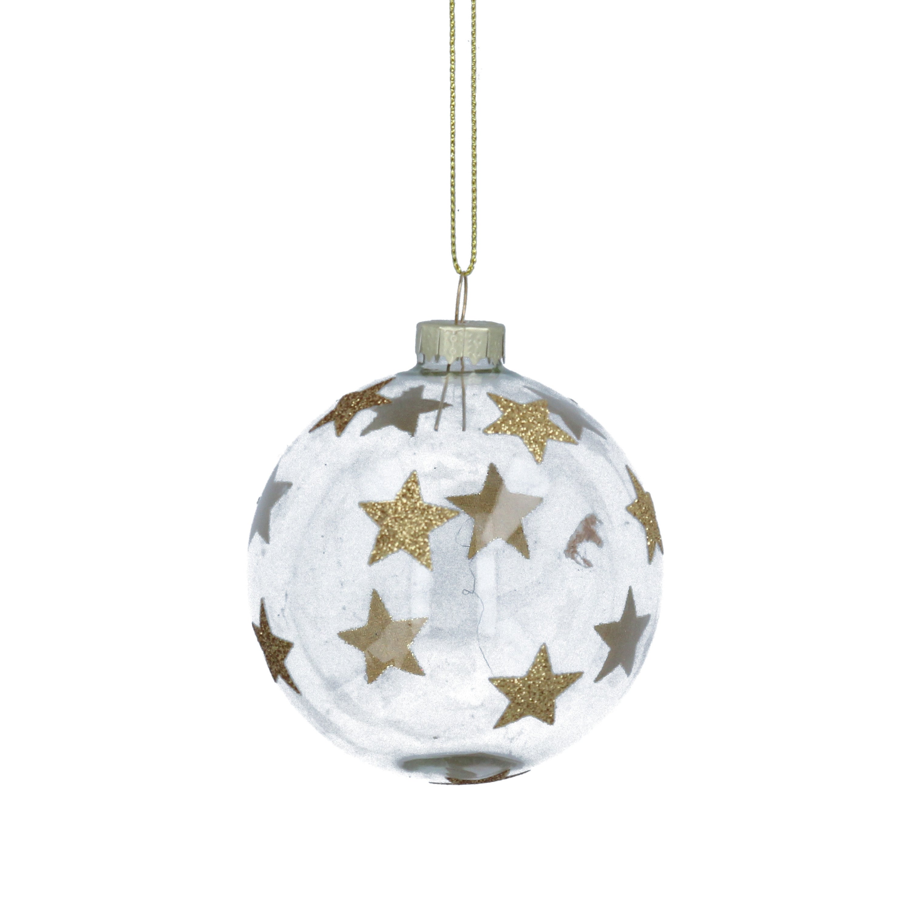 Pretty glass bauble decorated with gold stars - would suit any tree.