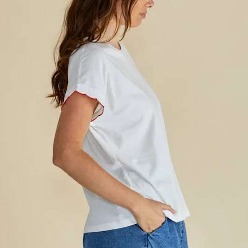 The Sloane Scallop Tee brings a feminine touch to a classic silhouette. Crafted from soft cotton slub jersey, it features a round neckline and delicate scallop trim sleeves. The straight hem and relaxed fit make it an effortless choice for everyday wear. Comfortable, elevated, and transeasonal by design.