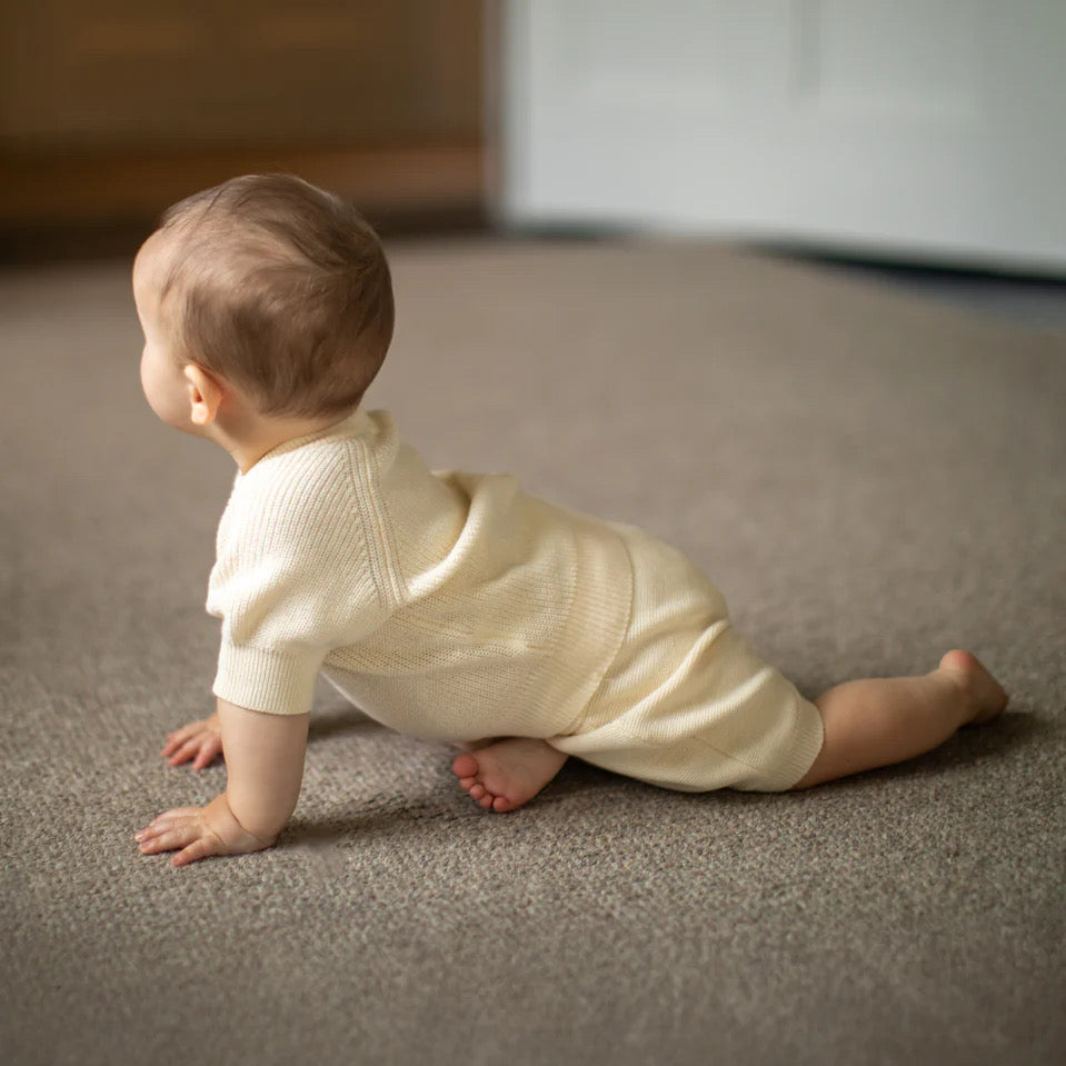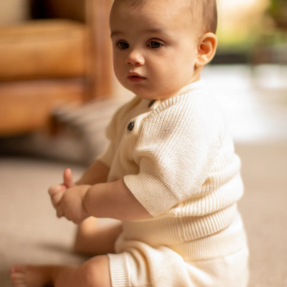 Foal is a two piece newborn - 6 month set. The trousers are soft and comfortable with an elasticated waistband legging and a soft rib cuff to the hem. The ribbed jumper is a raglan sleeve crew neck jumper with front button fastening to the neck.
