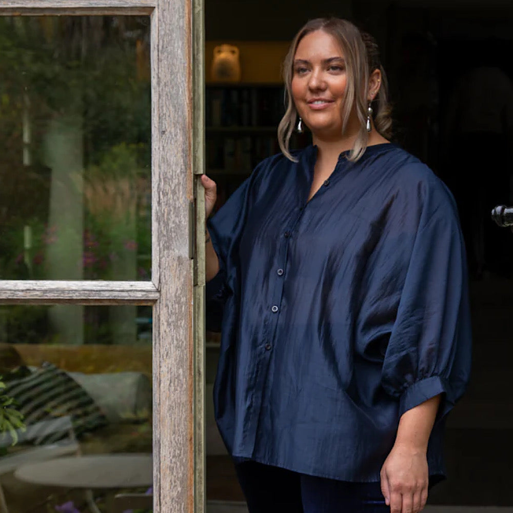 Poppy is the ultimate oversized shirt — relaxed in shape, elevated in finish. Crafted from fluid satin, it features a dramatic batwing silhouette, a neat grandad collar, and three-quarter length sleeves. An inverted pleat at the back adds soft volume and movement, making it as comfortable as it is stylish.