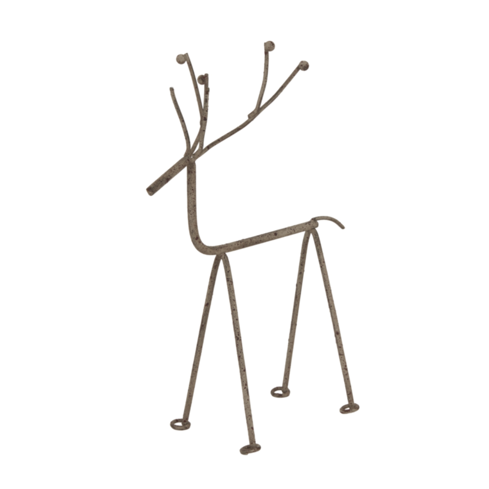 Sculpted metal reindeer combines rustic finish with precise detail. Stand-mounted design offers versatile display options. Perfect year-round décor piece for any setting.