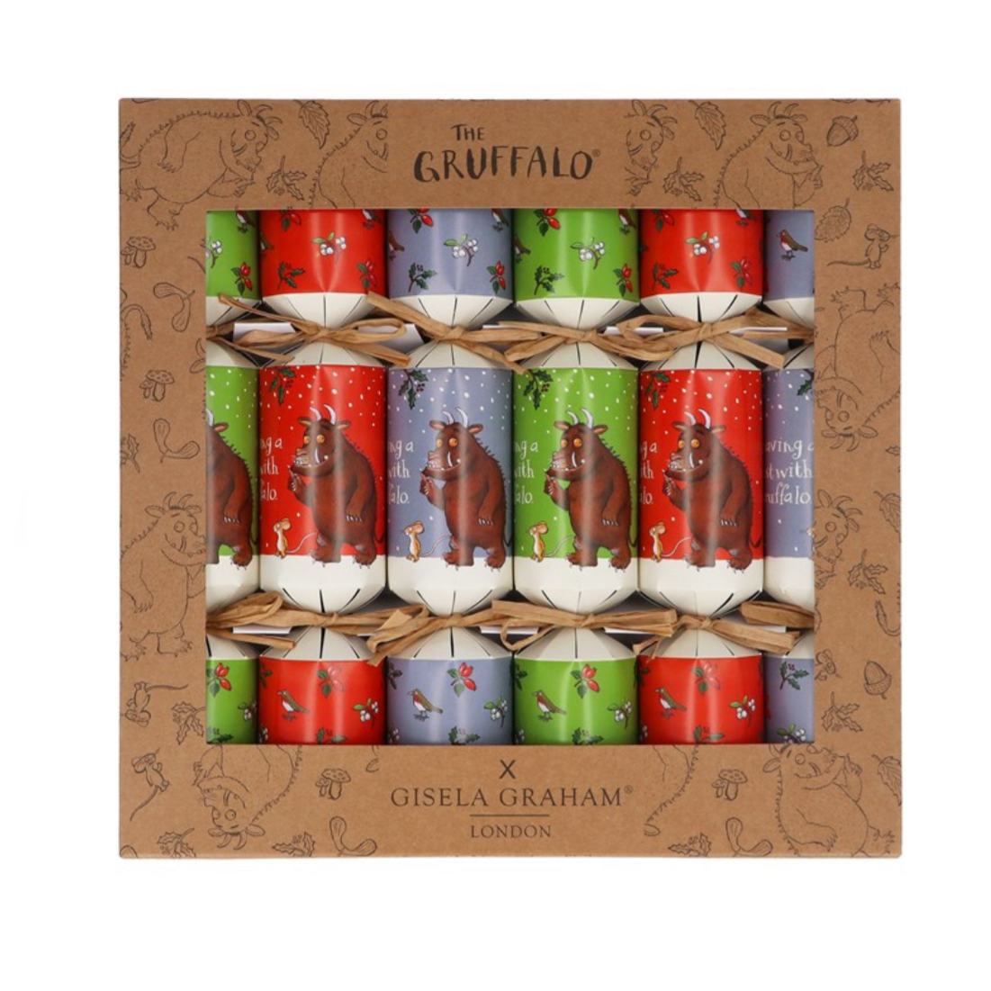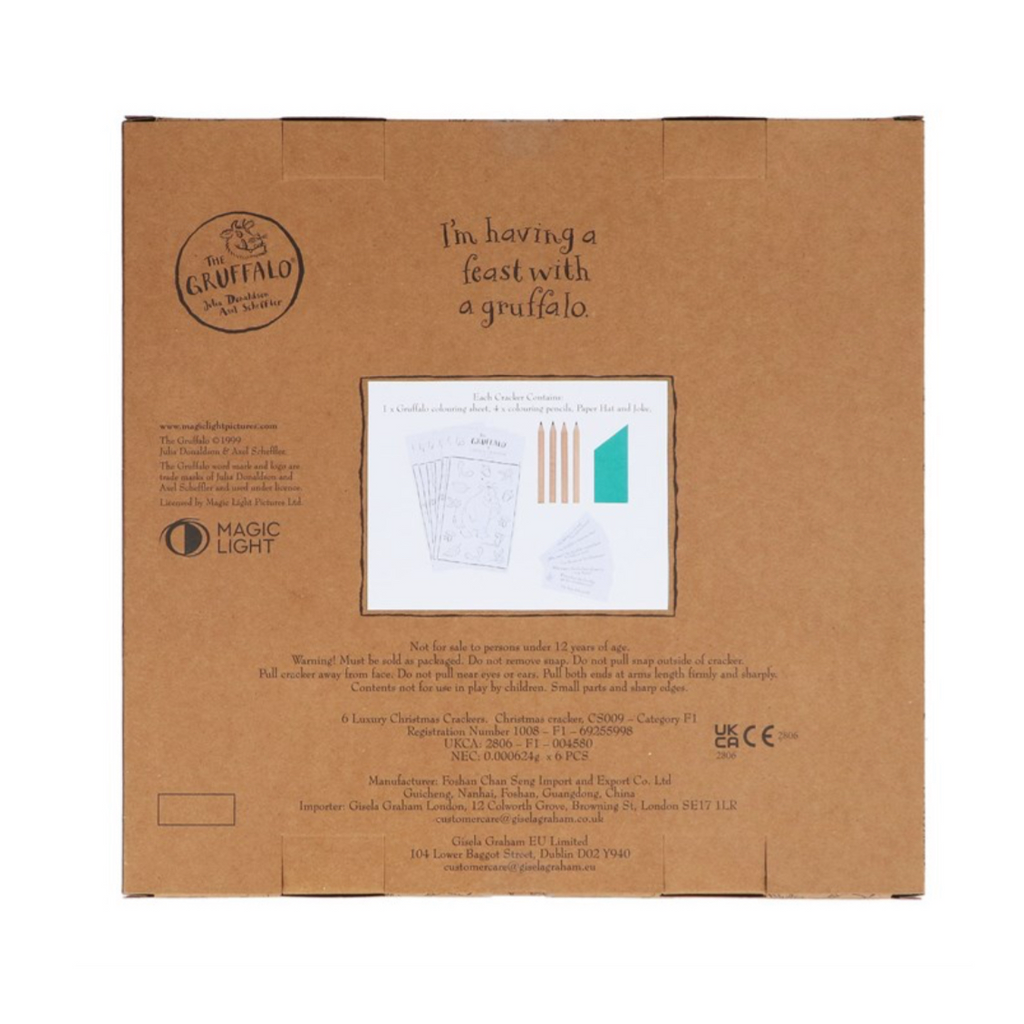 Cute Gruffalo Christmas crackers, filled with a hat, a joke, a colouring sheet and pencil.