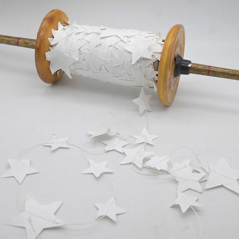 White paper star garland on cotton.  Perfect for gift wrap or dressing the tree!  Presented on a wooden spool for easy use.