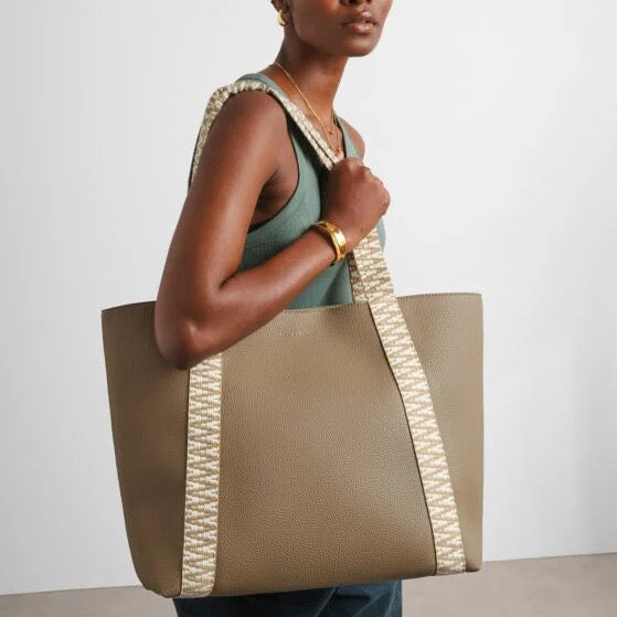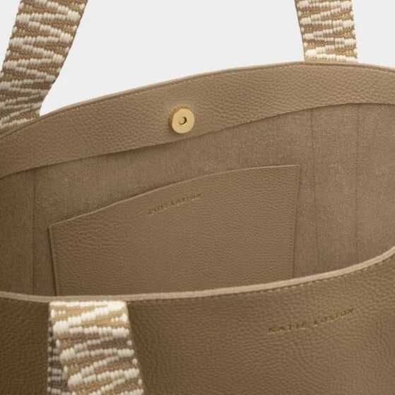 The Hallie Tote Bag in Taupe showcases a patterned canvas shoulder strap, easy magnetic popper closure, and a protective suedette lining. Effortlessly stylish and generously spacious, this elevated shopper tote is designed to carry all your daily essentials, taking you from work commute to errand runs with ease.
