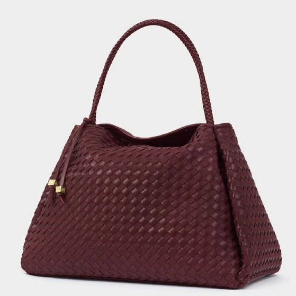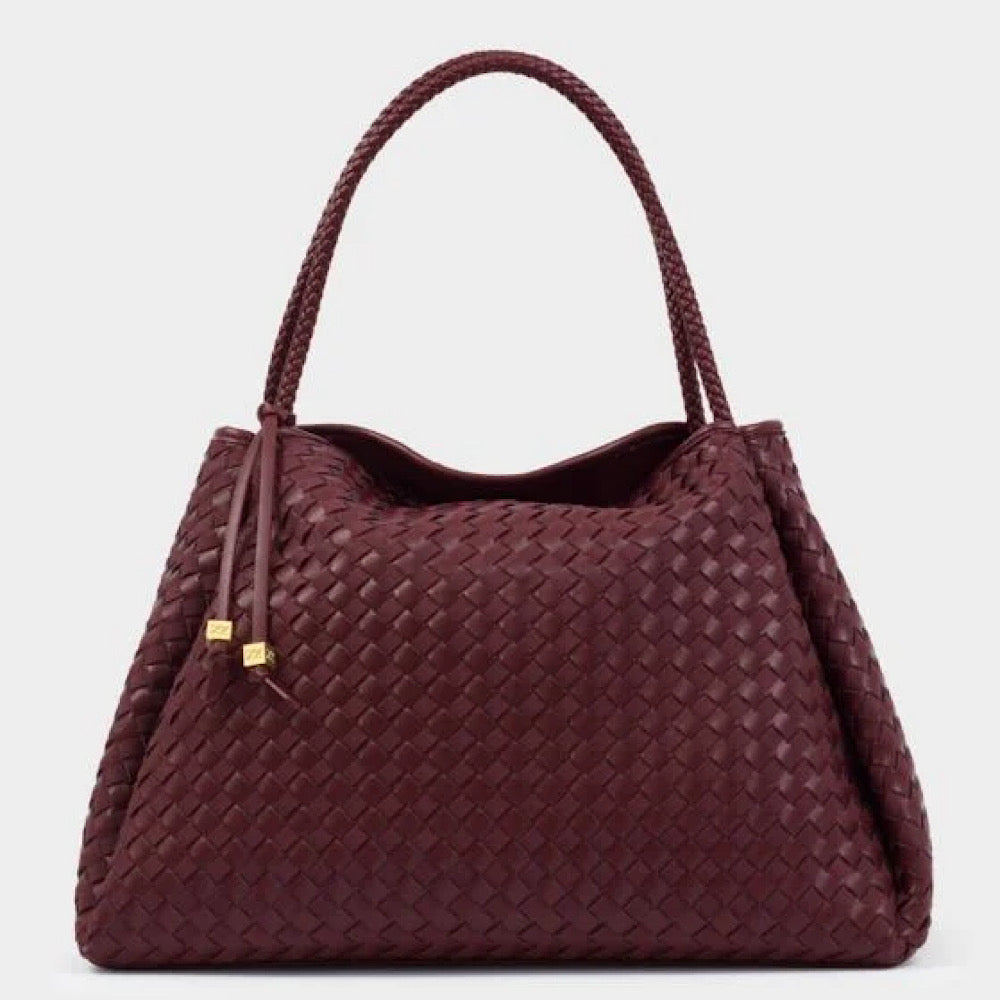 Our Nova Hand Woven Large Shoulder Bag in Cherry showcases a soft-to-touch suedette and vegan leather woven design, adding texture and dimension to any look. Considered details include an easy magnetic closure, an internal zip pocket for valuables, and a signature branded bag charm. Designed to suit both work and play, it’s the must-have profile of the season.