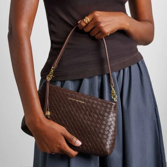 Showcasing a beautifully hand-woven design, our Nova Clutch in dark chocolate is a versatile must-have for your wardrobe rotation. Featuring a multiway strap, it easily transforms into a shoulder bag or wristlet to suit any occasion. Finished with our signature charm tassel detailing, it’s perfect for holiday nights and beyond.