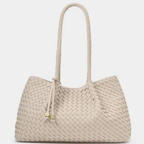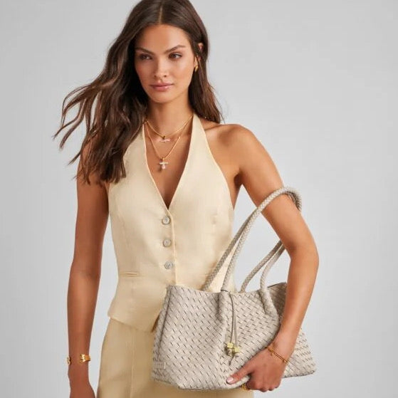 The Nova Small Shoulder Tote in Oyster is perfect for lightweight summer styling. Featuring hand-woven vegan leather, a signature branded bag charm, and long comfortable handles that make it easy to carry over the shoulder. Complete with a secure magnetic closure, it adds a touch of understated elegance to any outfit.