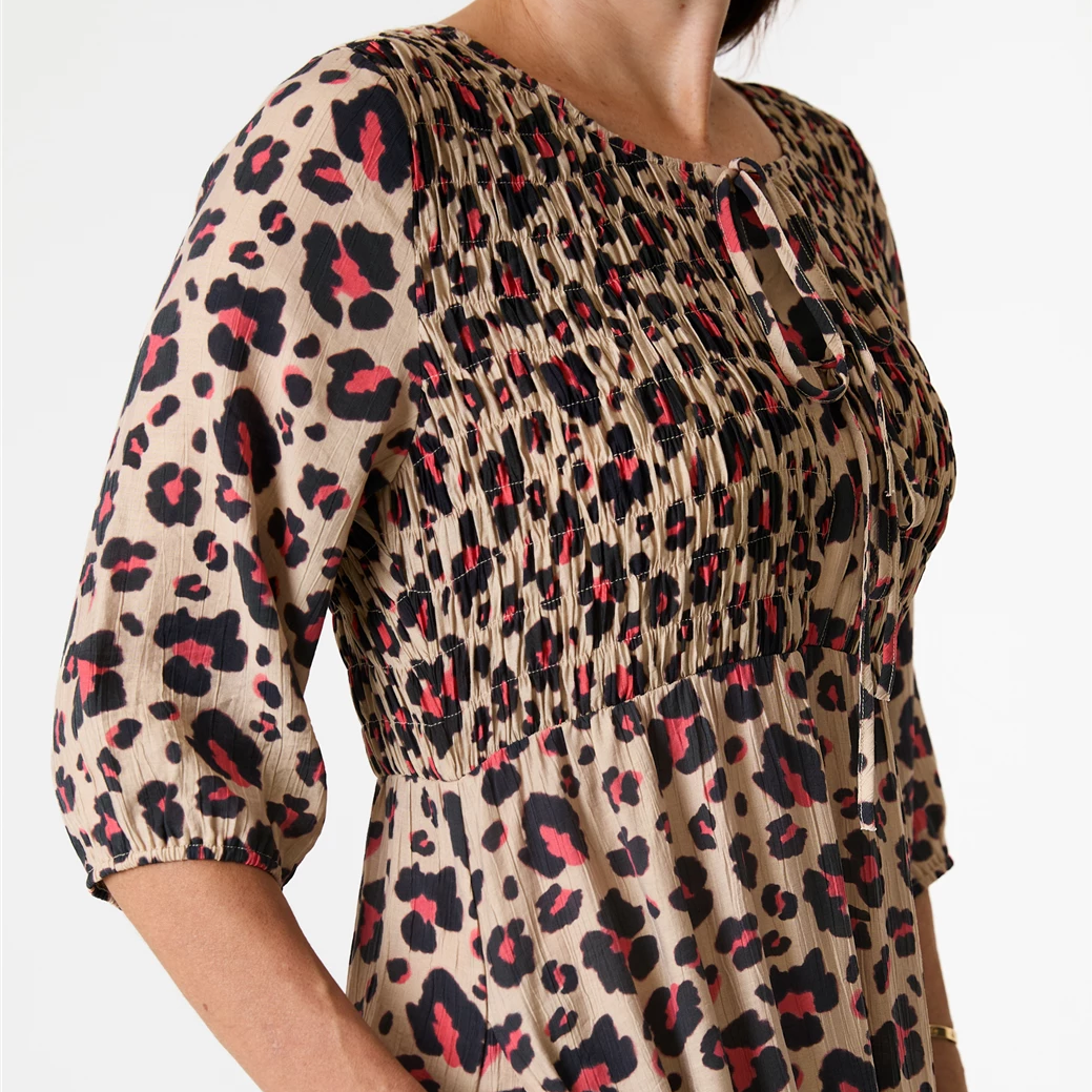 Dreams Leopard Smudge Shirred Midi Dress