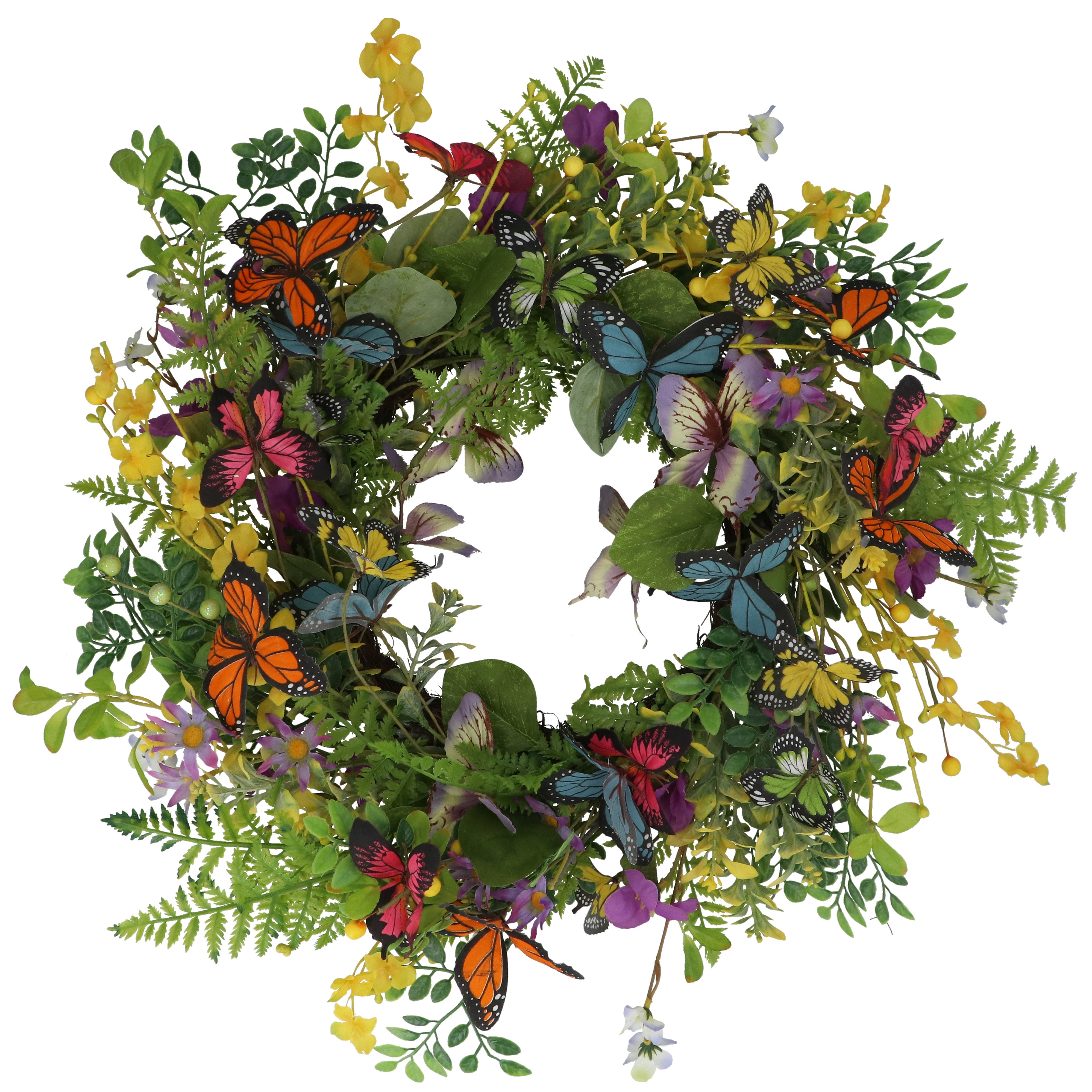 Pretty faux floral spring wreath with added butterflies, perfect for your front door, or even used on a table with a candle.