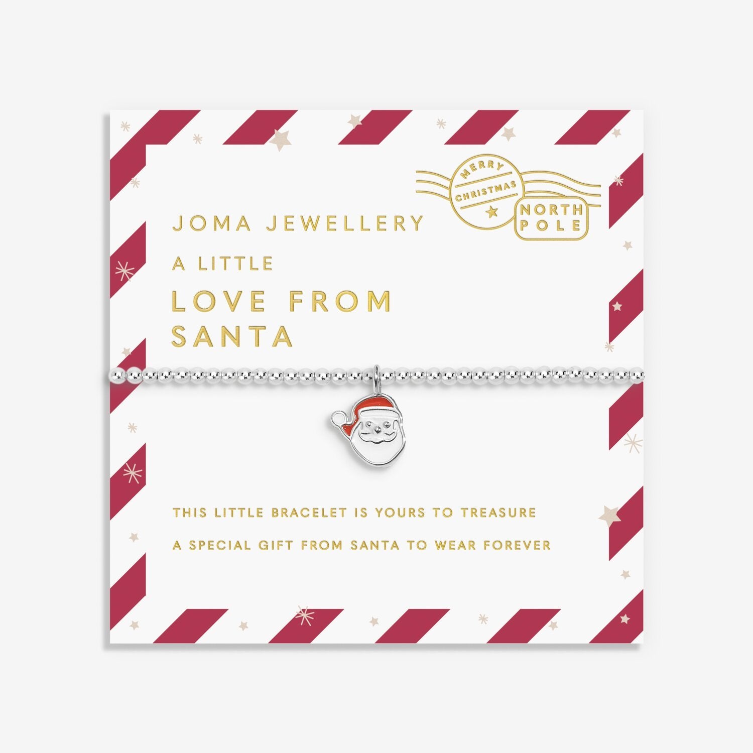 Bring the magic of Christmas to life with our Kids' Love From Santa Collection! With its shining silver-plated beads, special Santa charm, candy cane stripe presentation card, and gold foil postage stamp, the Kids' Love From Santa 'Love From Santa' Bracelet In Silver Plating has been lovingly sent from the North Pole by Santa, specially for your little one.