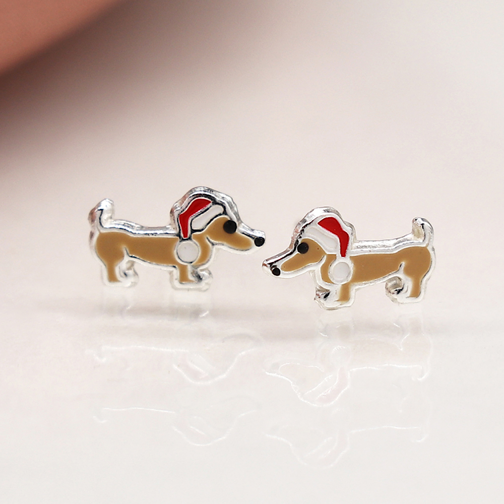POM Sterling Silver Christmas Dashshund Stud Earrings