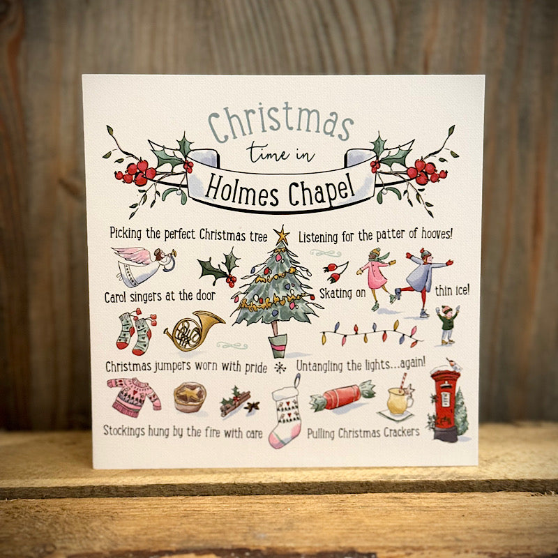 Holmes Chapel is our beautiful idyllic village in Cheshire, now famous for being former One Direction's star Harry Styles' childhood home town. The card features iconic landmarks in our village, including the Viaduct, Mandeville's Bakery and of course St Luke's Church that sits at the centre of the village.