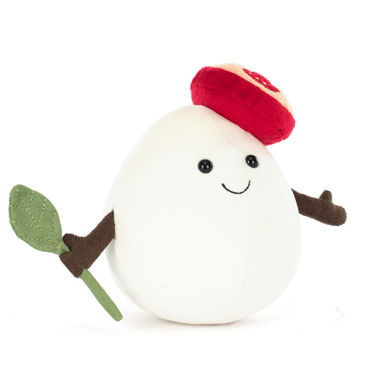Amuseables Mozzarella is a cuddly Caprese cutie. A soft ball of cream fur, this fromage friend is adorned with a big smile and a chunky slice of textured tomato. With cocoa fine cord arms holding a suedette Basil leaf, this cheese sweetie is the perfect gift for foodie friends and cheese lovers alike!