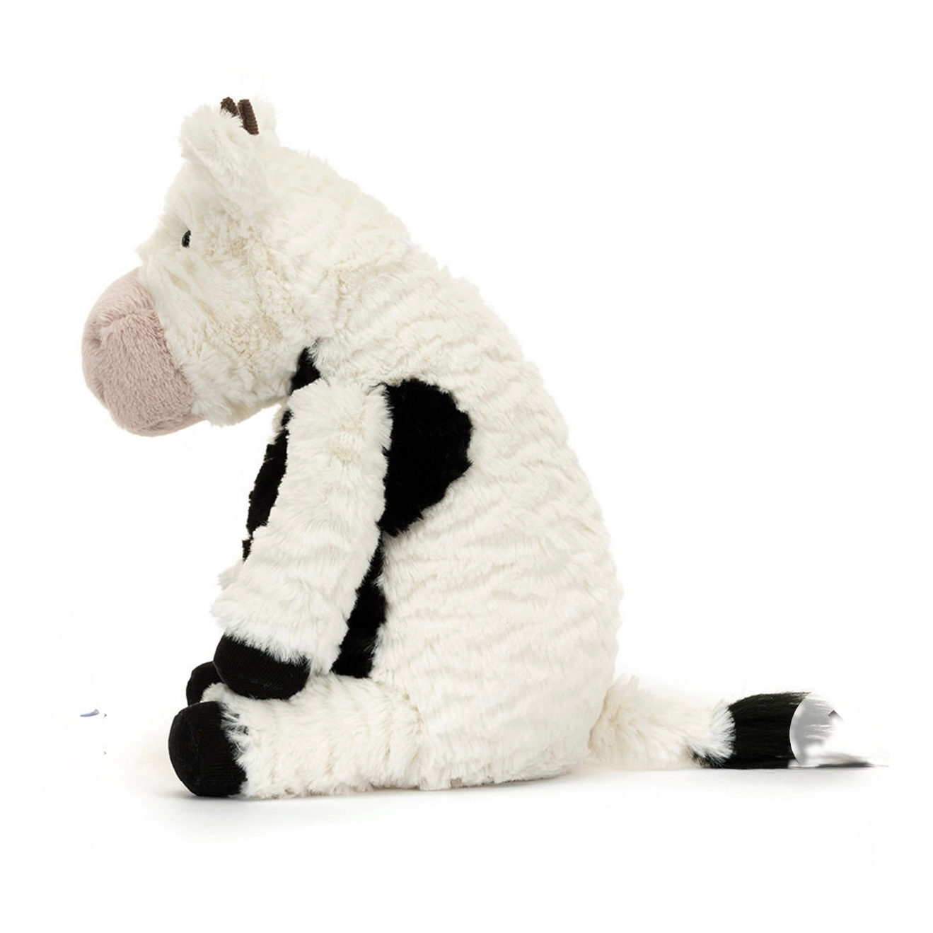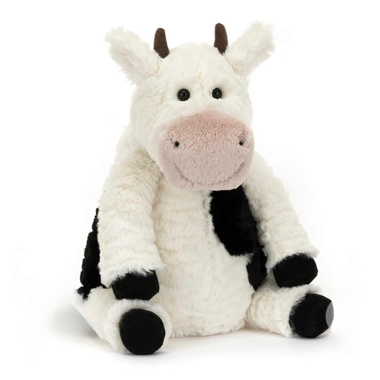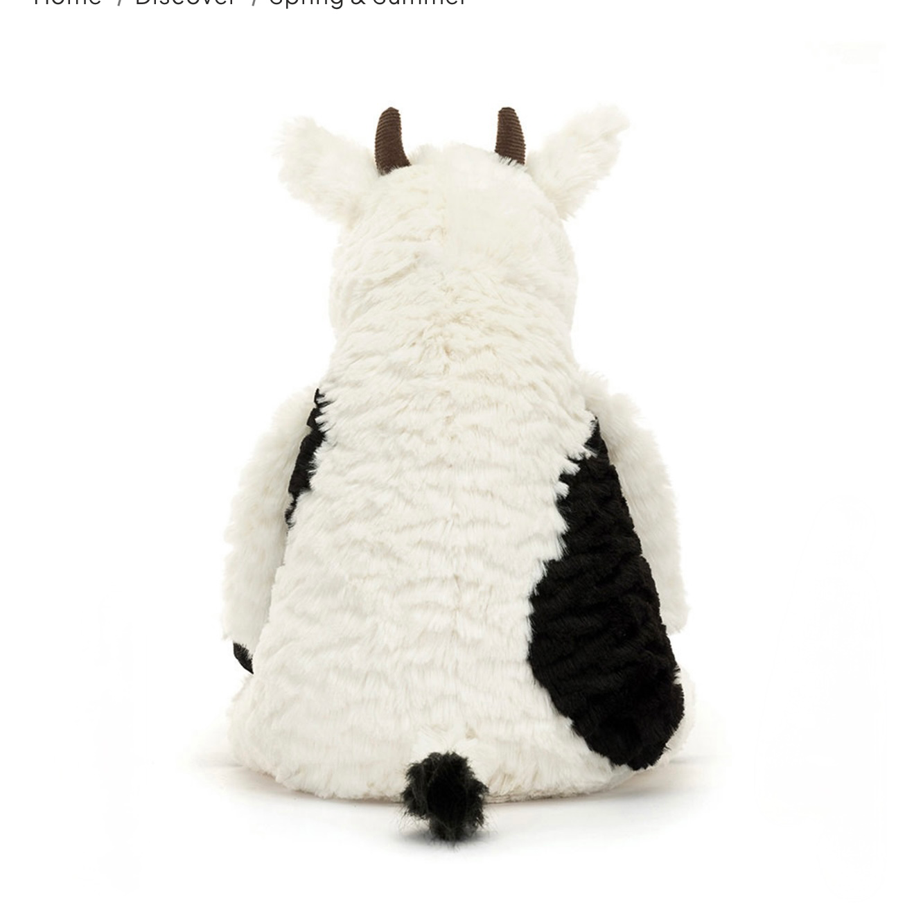 Mooliet Cow is the sweetest softie in the herd. In textured cream fur with black splotches, Mooliet has soft black hooves and an oatmeal snout. With fine cord horns and a big, stitched smile, Mooliet loves to flick that fluffy tail tip and hug till the cows come home!