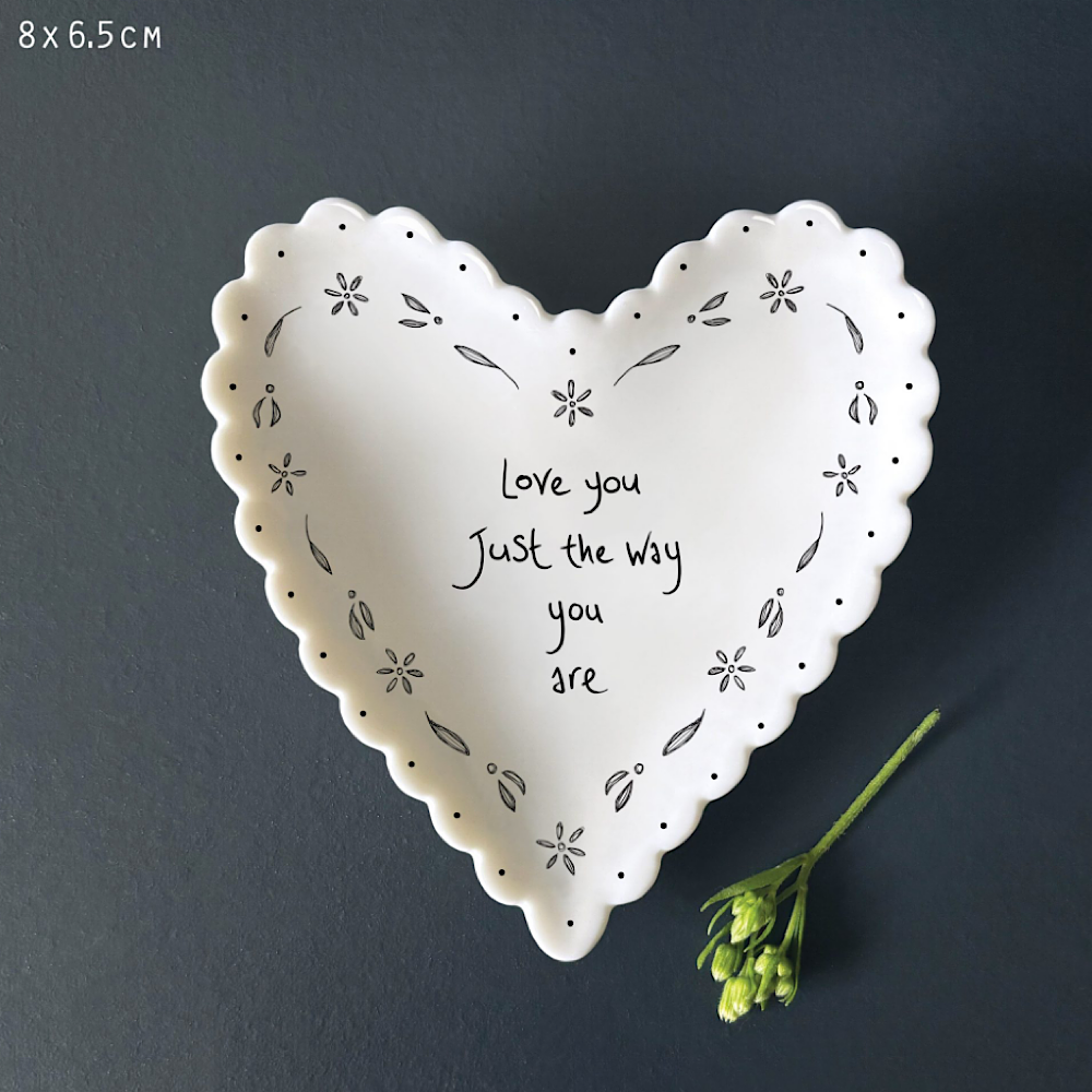 Pretty porcelain scallop edged trinket dish with the sentiment,’Love you just the way you are’. The perfect gift for a loved one…