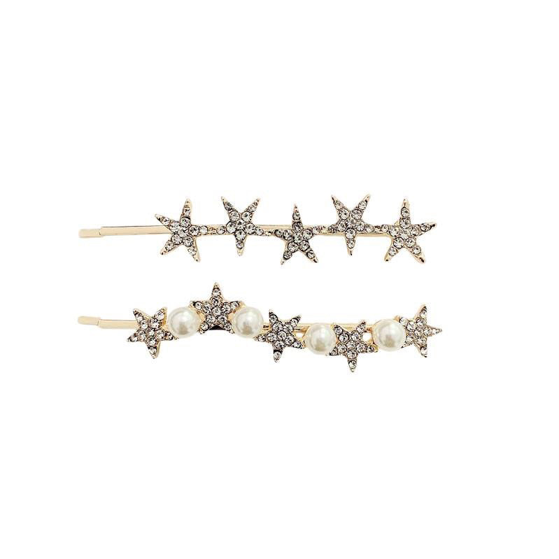 Pretty gold coloured sparkly hair slides with stars and pearls.