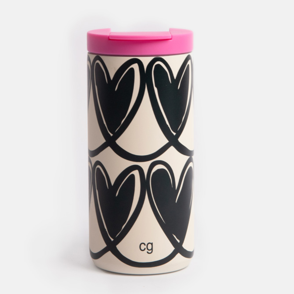 On the go coffee cup in our new mono linked hearts print. Double walled stainless steel cup, with sealed, leakproof flip lid.