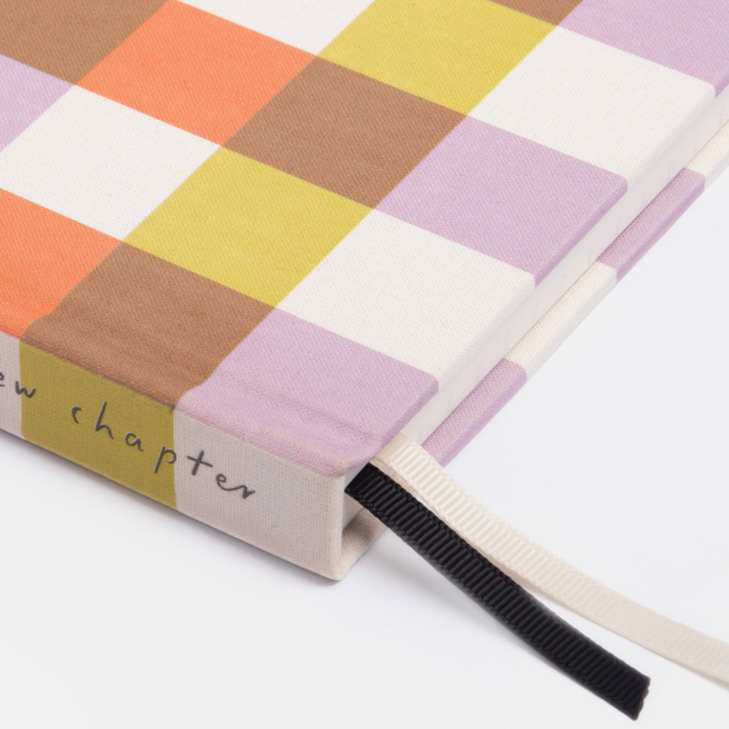 An A5 hardback notebook in a colourful multi-check design, featuring three internal sections for organised note-taking, planning and lists.