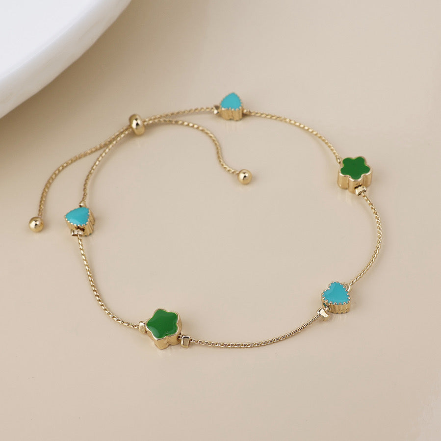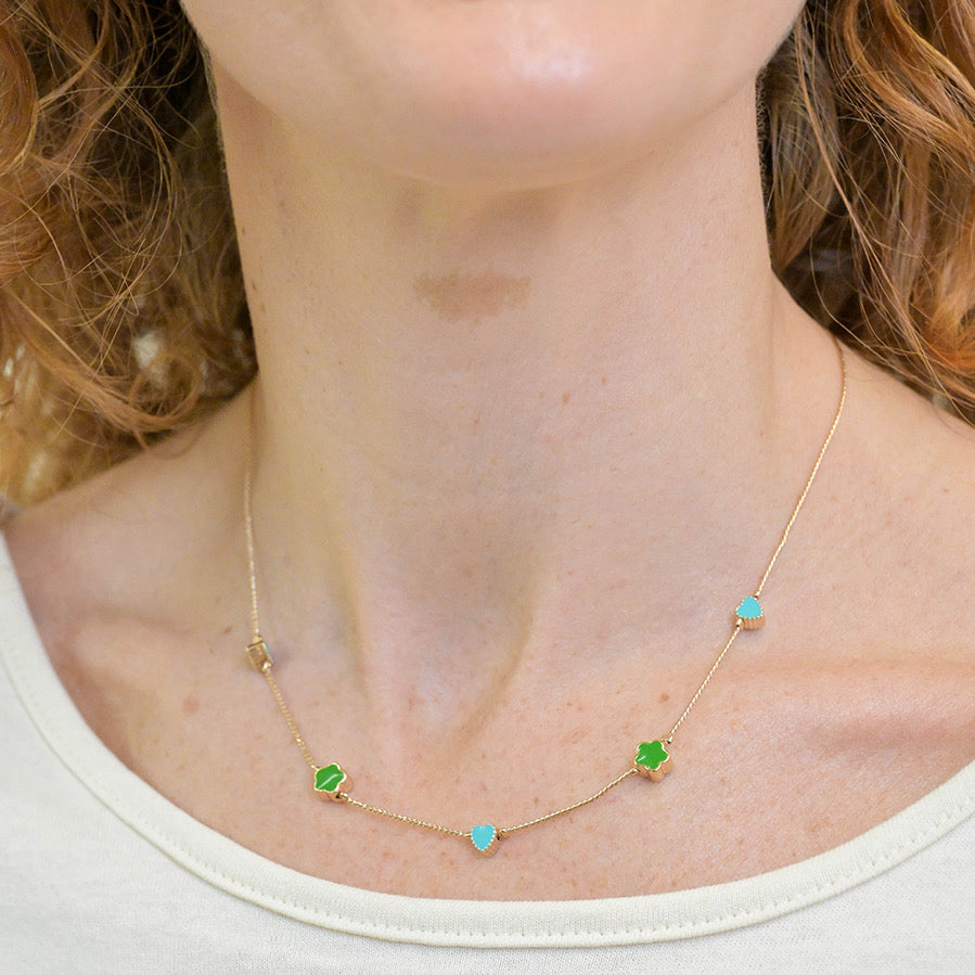 Faux gold plated twist chain station necklace with green enamel flower and turquoise heart beads.