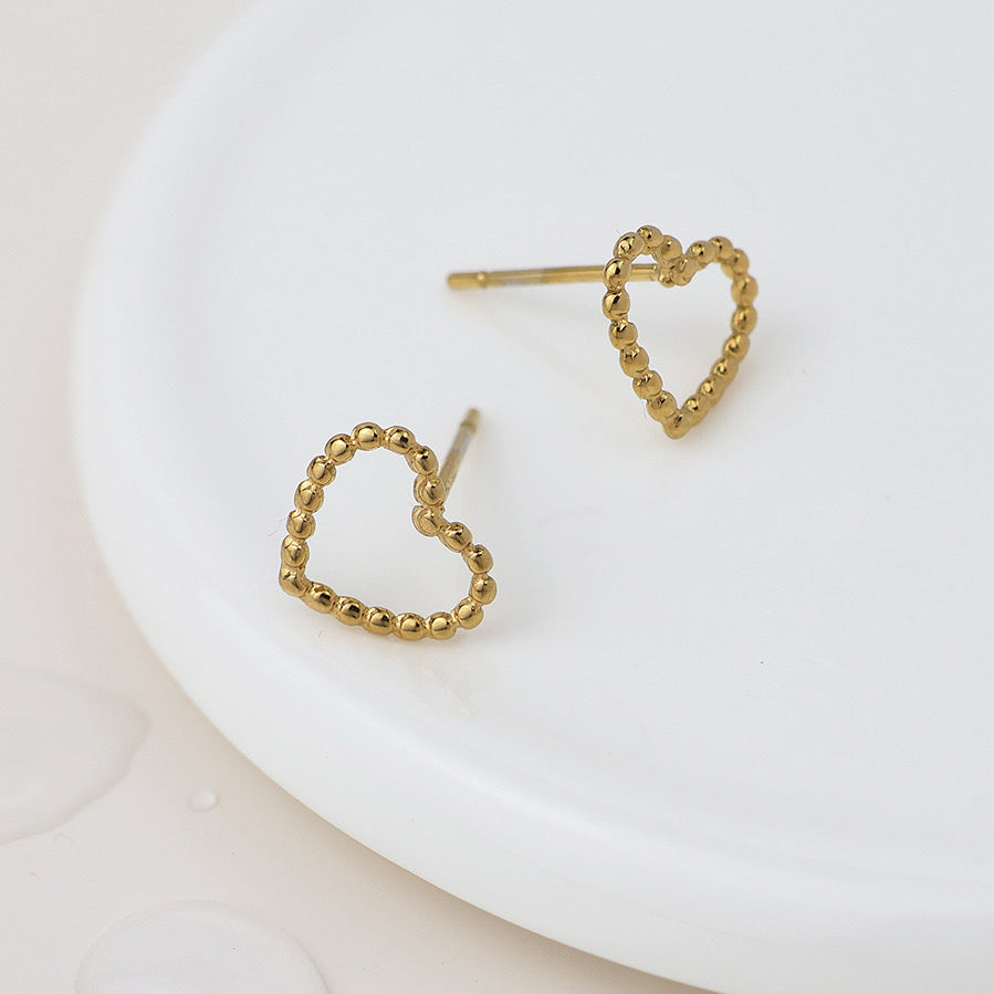Stainless steel waterproof 14k gold plated open heart shape stud earrings with fine bobble bead texture.