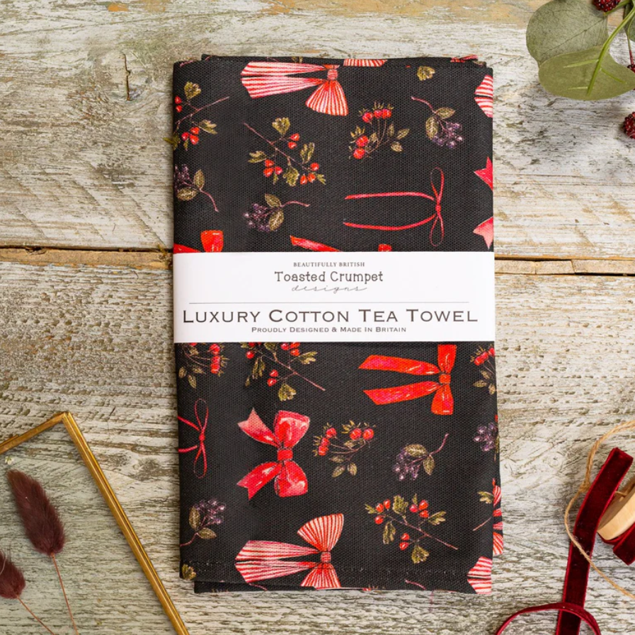Toasted Crumpet Bows & Berries Noir Tea Towel
