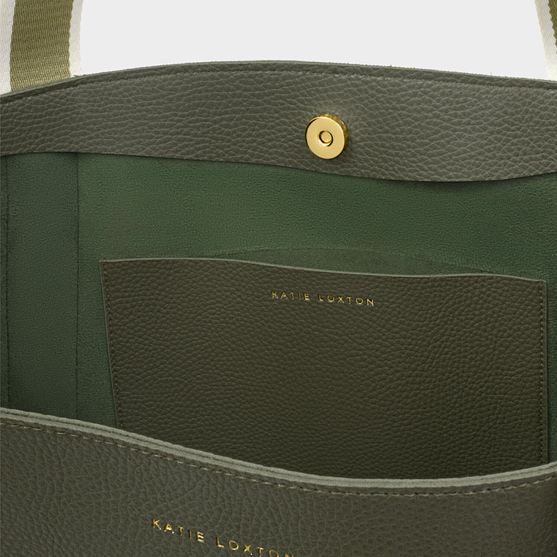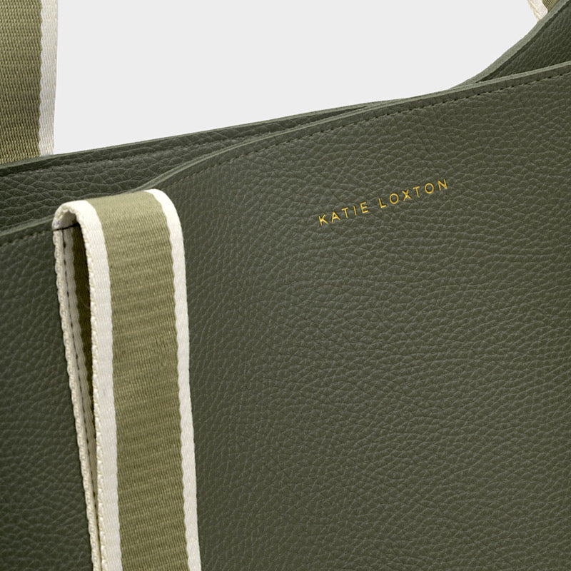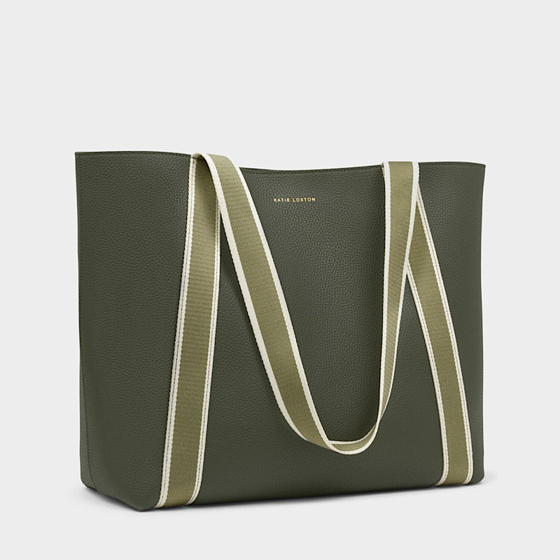 Our Hallie Tote Bag in Khaki showcases a patterned canvas shoulder strap, easy magnetic popper closure, and a protective suedette lining. Effortlessly stylish and generously spacious, this elevated shopper tote is designed to carry all your daily essentials, taking you from work commute to errand runs with ease.