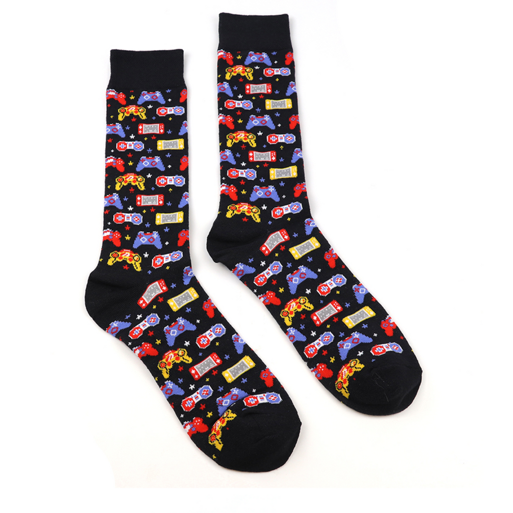 Recycled and organic yarn blend novelty gift socks for men in black with themed patterns.