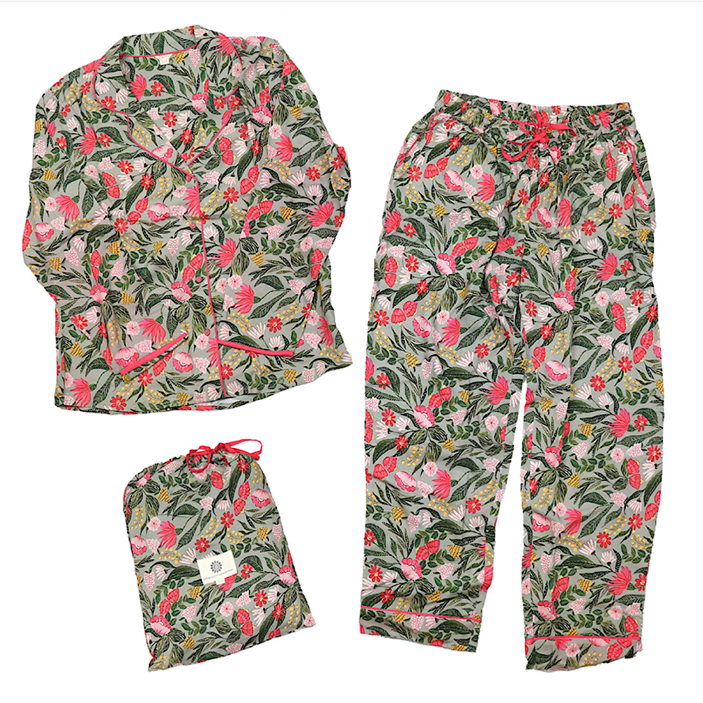 Slate grey luxury pyjamas with a dusky tropical botanical print and matching drawstring bag.